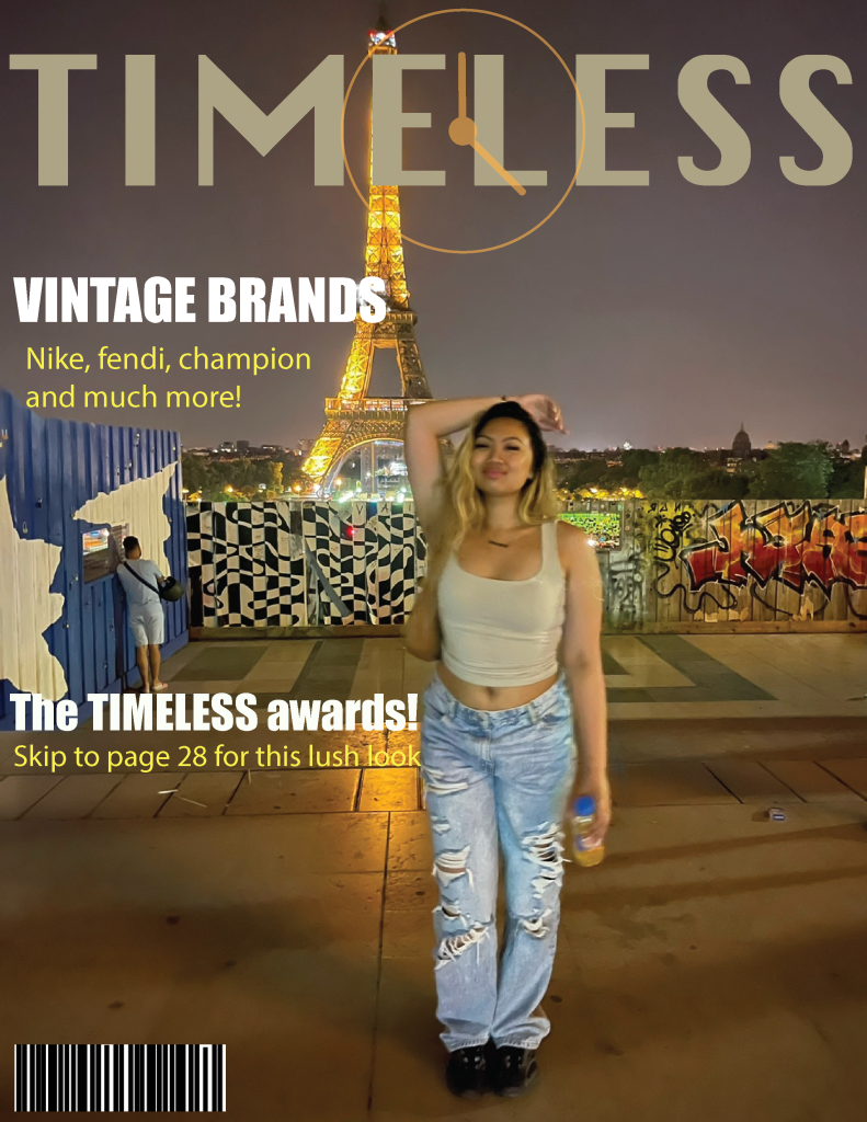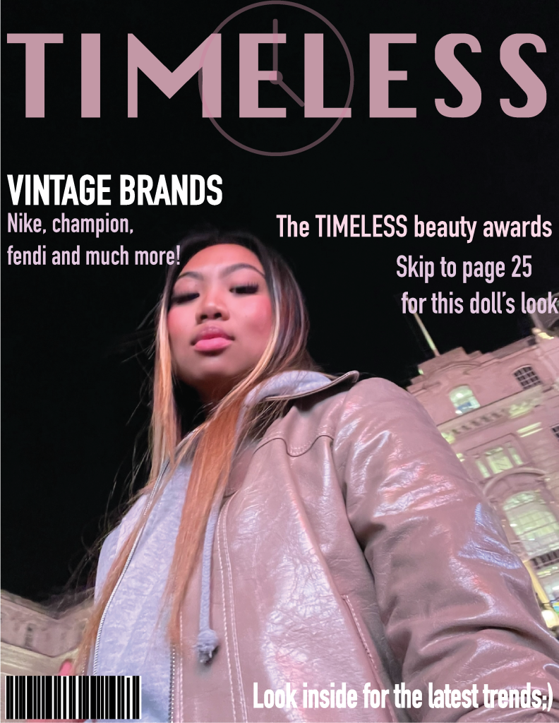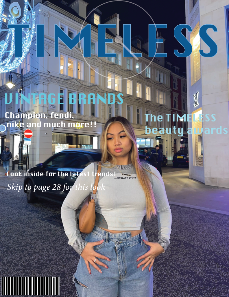 For each of my designs I used a compositional grid format which allowed all three of my designs to flow when placed side by side. I created my own barcode to make the cover more authentic looking real. I feel as though my masthead and font choice definitely gives the magazine a more minimalistic feel and draws more attention to what is actually there. I changed my masthead quite a few times as it did not look quite right with the images I had photographed and chosen to use for my covers. My aim for this cover was to have abstract space in which to model would not be compromised with text, this is why the model is more on the right hand side rather than in the center, with the text alongside her on the left. I used the eyedropper tool to make the colours of the headline flow with the cover image, giving it a softer and more elegant look next to the Eifel tower. The bright pop of yellow refers back to the Eifel tower in the background, therefore referring back to the idea of fashion being timeless and chic. I really enjoyed designing this cover, when most people think of chic fashion they think of Paris and the Chanel stores in France, although the models attire is not your typical French attire, i feel like this cover is a twist between a chic Parisian vibe and early 2000’s streetwear. The early 2000’s style is a huge part of fashion as it goes in and out of fashion throughout the years, even the baguette bag the model has on her shoulder is a representation of the chicness and elegance y2k style can have.