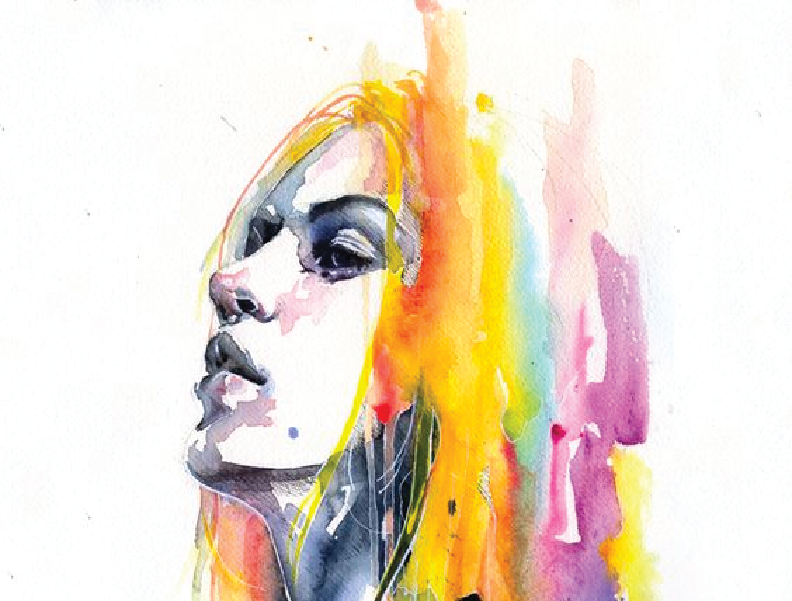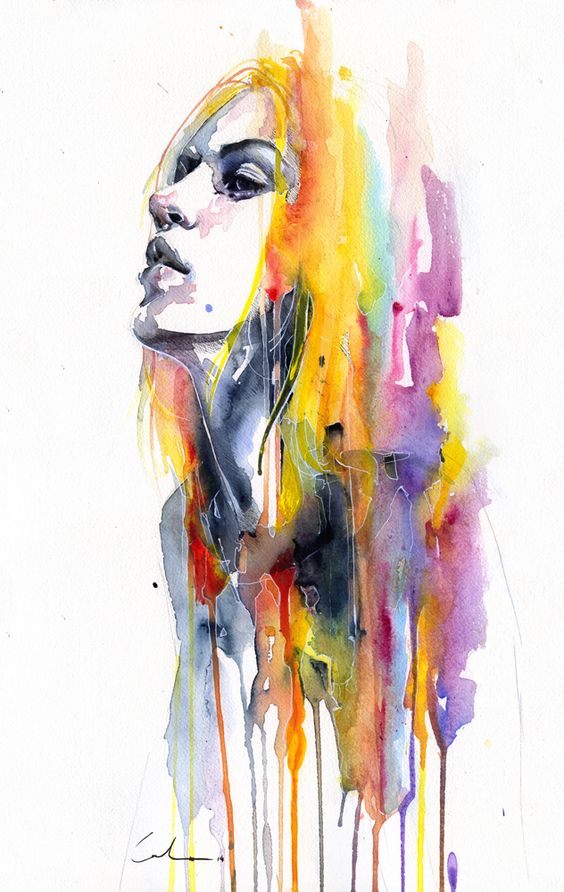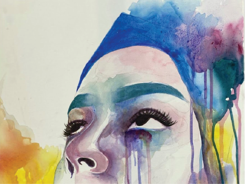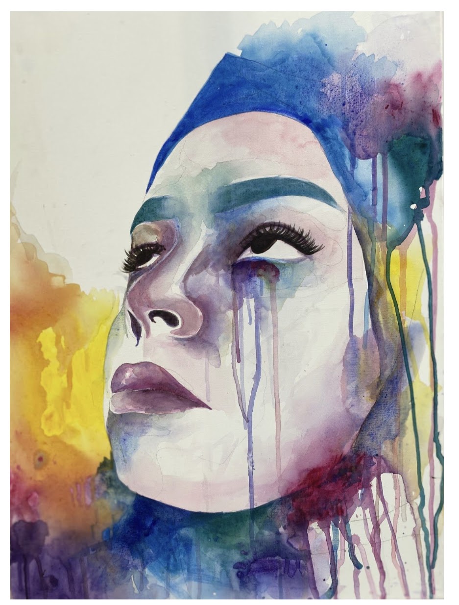 I redesigned this using watered down acrylic paint on a canvas as I found it easier to work with than watercolor and I found it to be much more opaque and full of color. I stood up the canvas and dripped water along the page to create the dripping/melting effect especially around the eyes and headscarf.
