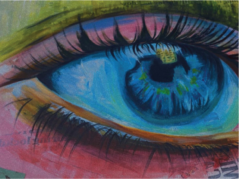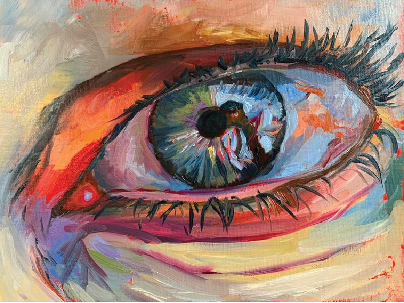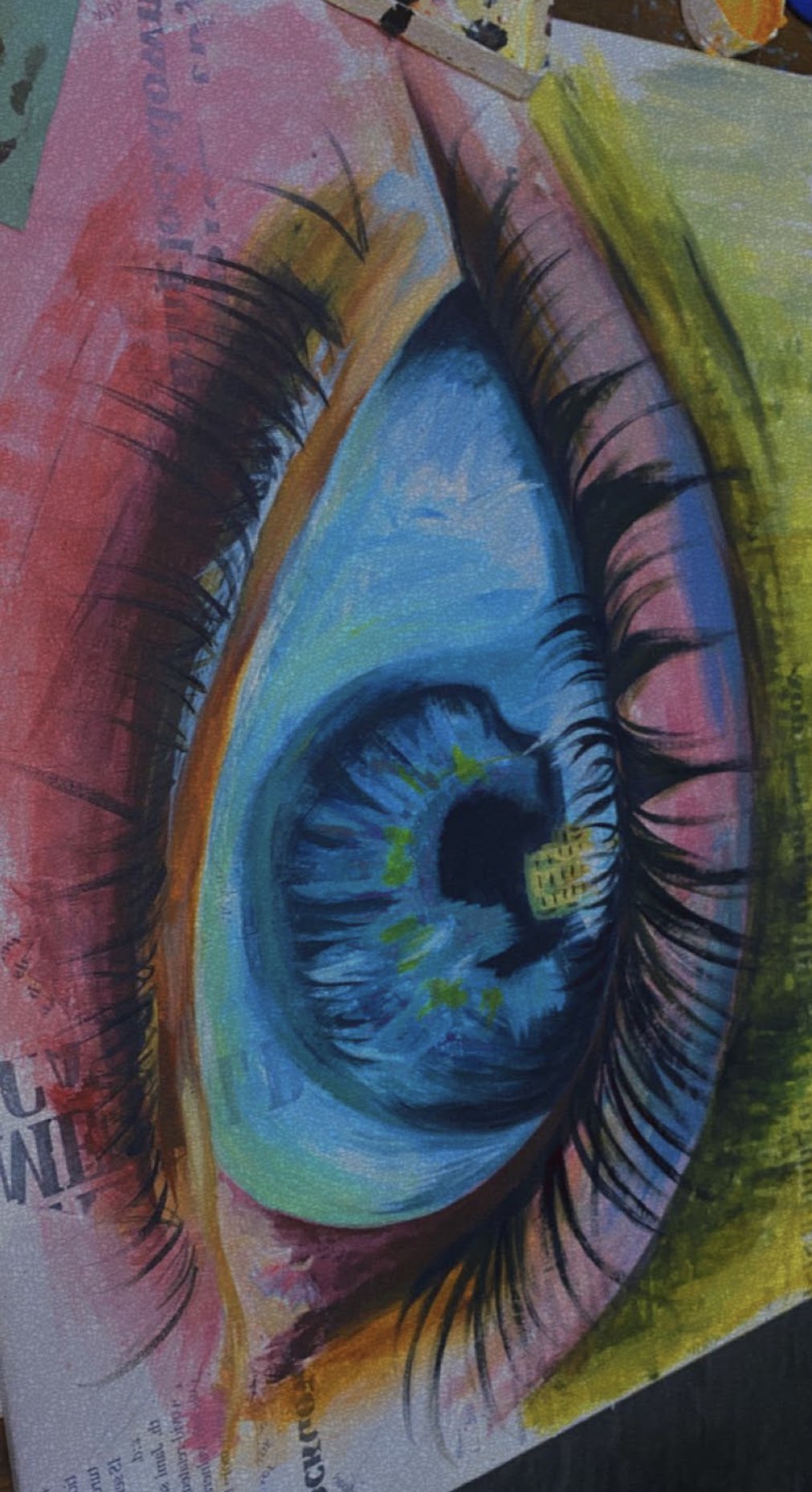 I redesigned this using acrylic paint and some ink around the iris as it was of a darker and thicker consistency. Dutch artist Vita Schagen has had work shown both domestically and in Russia. She wants to express all aspects of her life, such as her feelings, dreams, and love, through her artwork. Depending on her mood, the subject, and the feelings she wants to convey, Schagen uses a variety of painting techniques. On canvas, she uses enamels, lacquer, and oils to produce her works of art. I used hints of yellow as she does to help make the highlights stand out in a unique way without them just being white. I also mixed a lot of the colours using yellow so that they would have the same undertones and would flow together more cohesively.