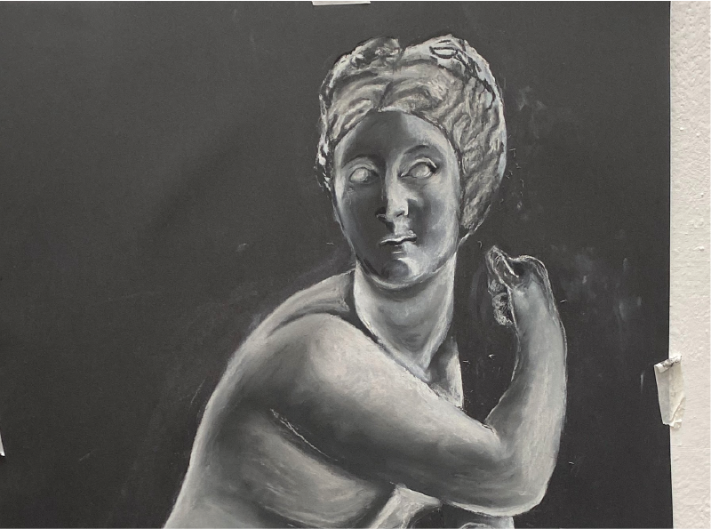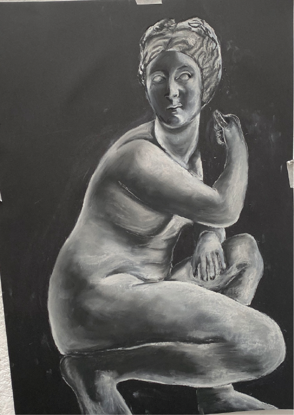 William Lehmbruck is renowned for his sculptures of elongated, slender figures whose sombre, typically disappointed movements communicate reflection and a quiet, gloomy atmosphere. After moving to Paris in 1910 to continue his studies, Aristide Maillol, Auguste Rodin, and Friedrich Nietzsche's theories had an effect on him. He was obliged to go back to Germany when World War I started. He worked while serving as a medic in Berlin and he was released in February 1916 due to hearing issues. During that year he escaped the suffering of war and moved to Switzerland. He was elected to the Prussian Academy of Arts after moving back to Berlin in 1919. Success couldn't make up for his sadness and suffering, which was made worse by marital issues and divorce, once he was divorced, he then killed himself six days later. My response to his work was made using chalk and charcoal as i felt it did his work and technique the most justice, I was able to get all of the highlights and shadows accurately, I did this as I had no access to clay.