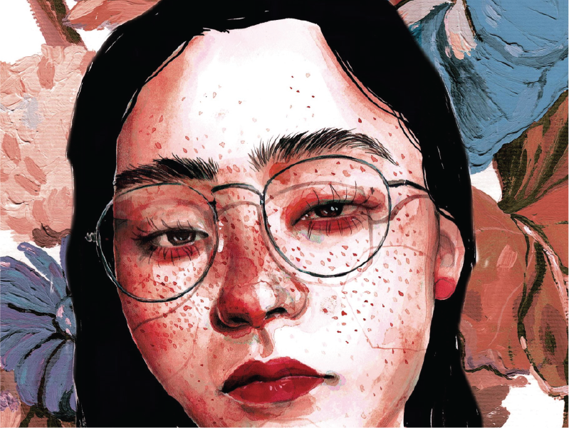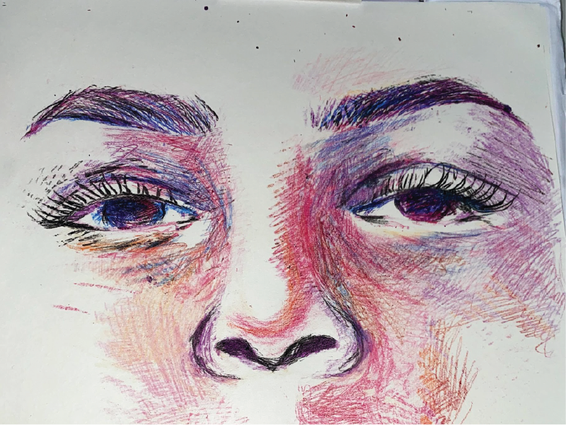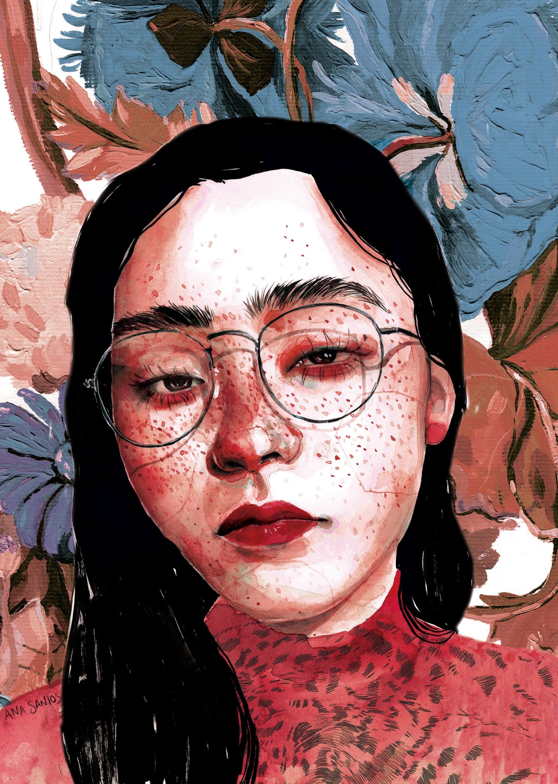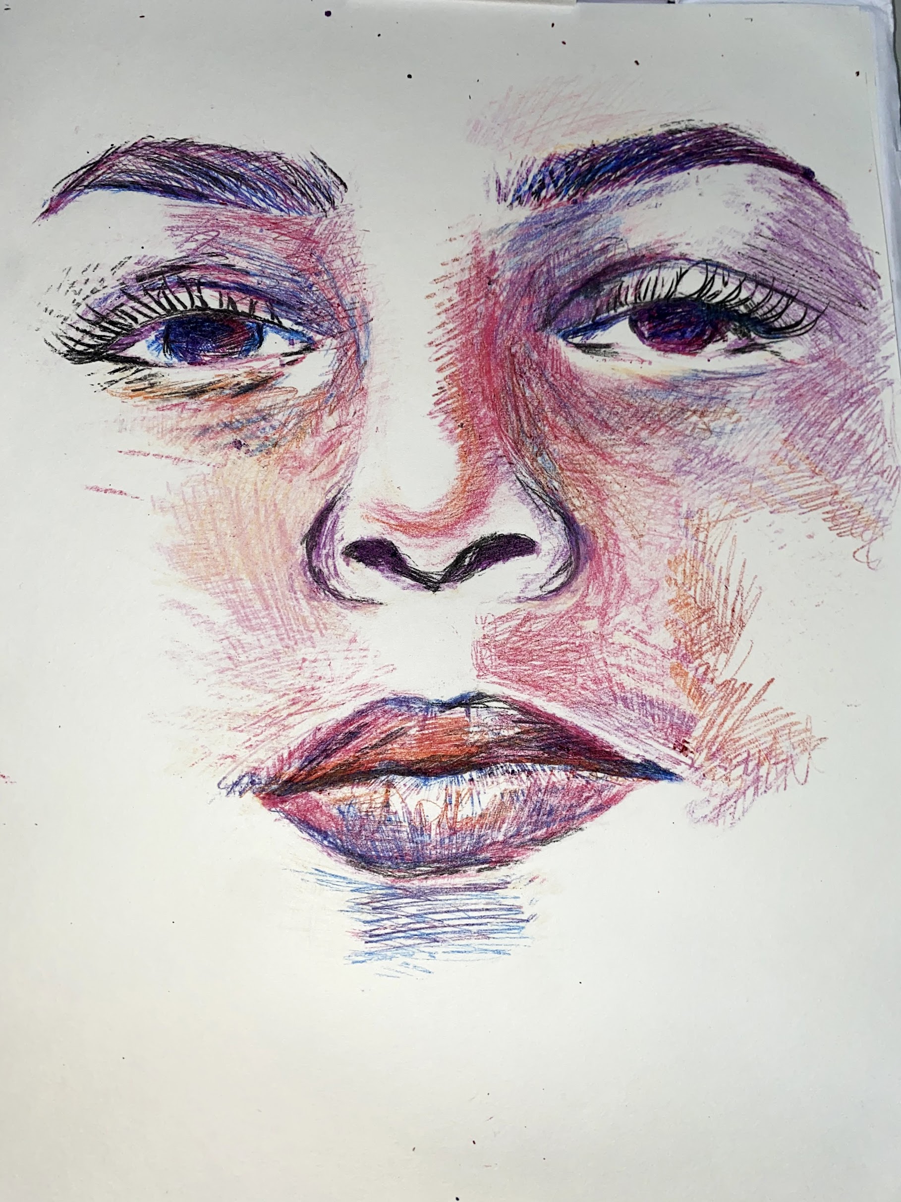 I created this piece using coloring pencils and I blended using an orange shade as I felt it went the best over the shades of pink I used inspired by Ana Santos' work. I use a textures table underneath the paper whilst I was drawing to create texture around the face where the artist would typically use freckles to create more dimension.
