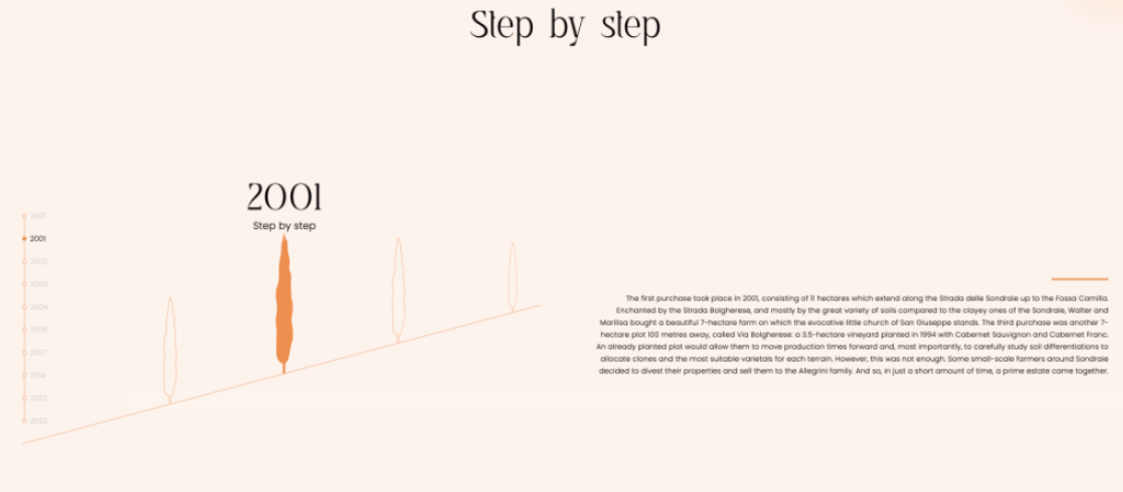 Another timeline example is shown in a unique way. This is an example from the wine company Poggio al Tesoro. In the designing of this, parallax is clearly used, the timeline will stay the same where whilst the information changes and moves. For some people, this can help make the concept of the design easier to understand because the image starts to ascend as well, letting you know that you aren't trapped or stuck in one section of the page.