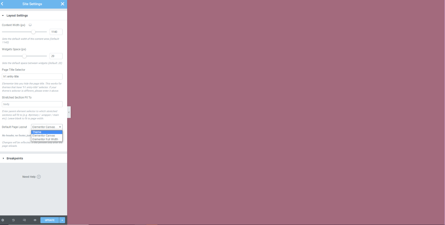 Go onto site settings and select layout, change it from theme to elementor canvas, this is to ensure you have a larger and clearer space to work on.