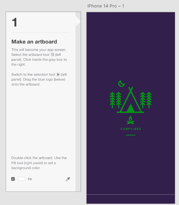 The "Campvibes" exercise was our first attempt at a UI/UX exercise that was centred around user-friendliness. First, a new artboard for the app screen is created. The logo was positioned in the centre of the page, and the background colour was then altered. Technically speaking, this was a relatively straightforward assignment, requiring most of the attention to be put into choosing a suitable colour scheme for the page (I went with purple because it seems appropriate for a night time camping trip).